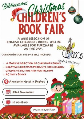 20 июля 2025 года в Paphos пройдёт Children’s Book Fair - детская книжная ярмарка в Almyra Hotel. На ярмарке будет представлен большой выбор английских детских книг, которые можно купить в этот же день. В подборке заявлены разные форматы и темы: художественная литература (fiction), познавательные книги (non-fiction), книги с заданиями и активити (activity books) и другое. Ярмарка рассчитана на детей в возрасте 1-12 лет.