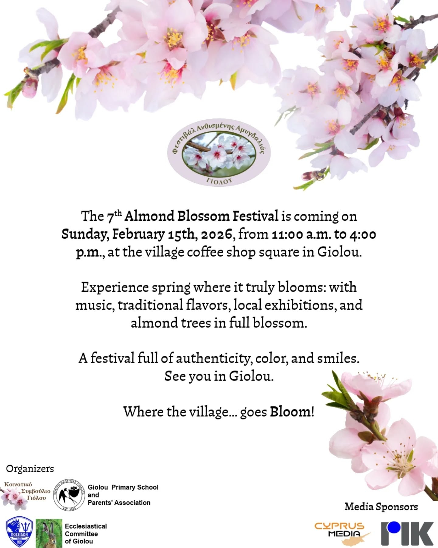 7-й Фестиваль цветения миндаля пройдёт в воскресенье, 15 февраля 2026 года, с 11:00 до 16:00 на центральной площади у деревенского кафе в деревне Гиолу.