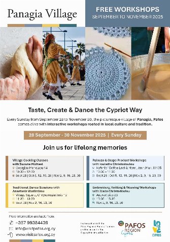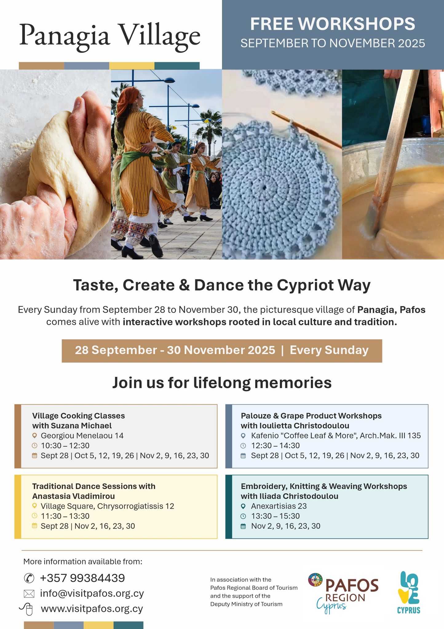 Участники смогут научиться готовить палузе и другие угощения из винограда, посетить мастер-классы по рукоделию и вышивке, насладиться традиционной музыкой и танцами и открыть для себя очарование сельской жизни кипрских холмов.
